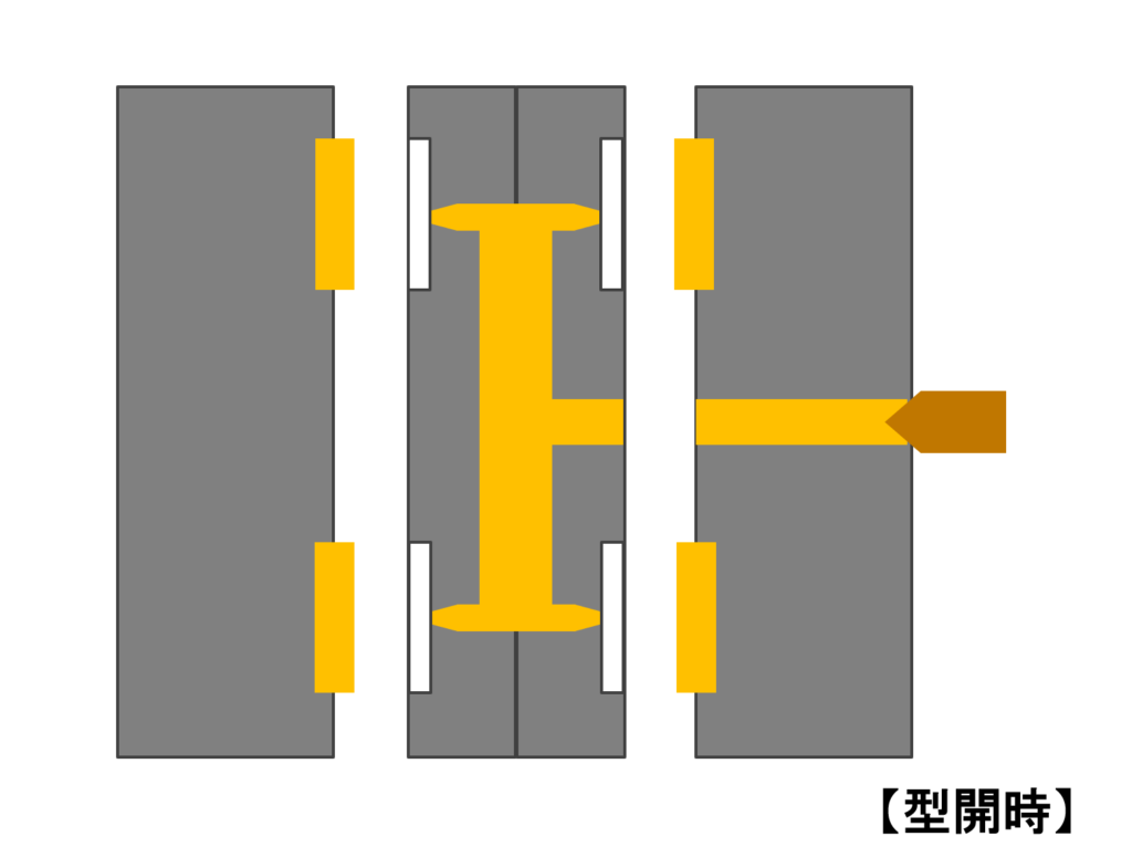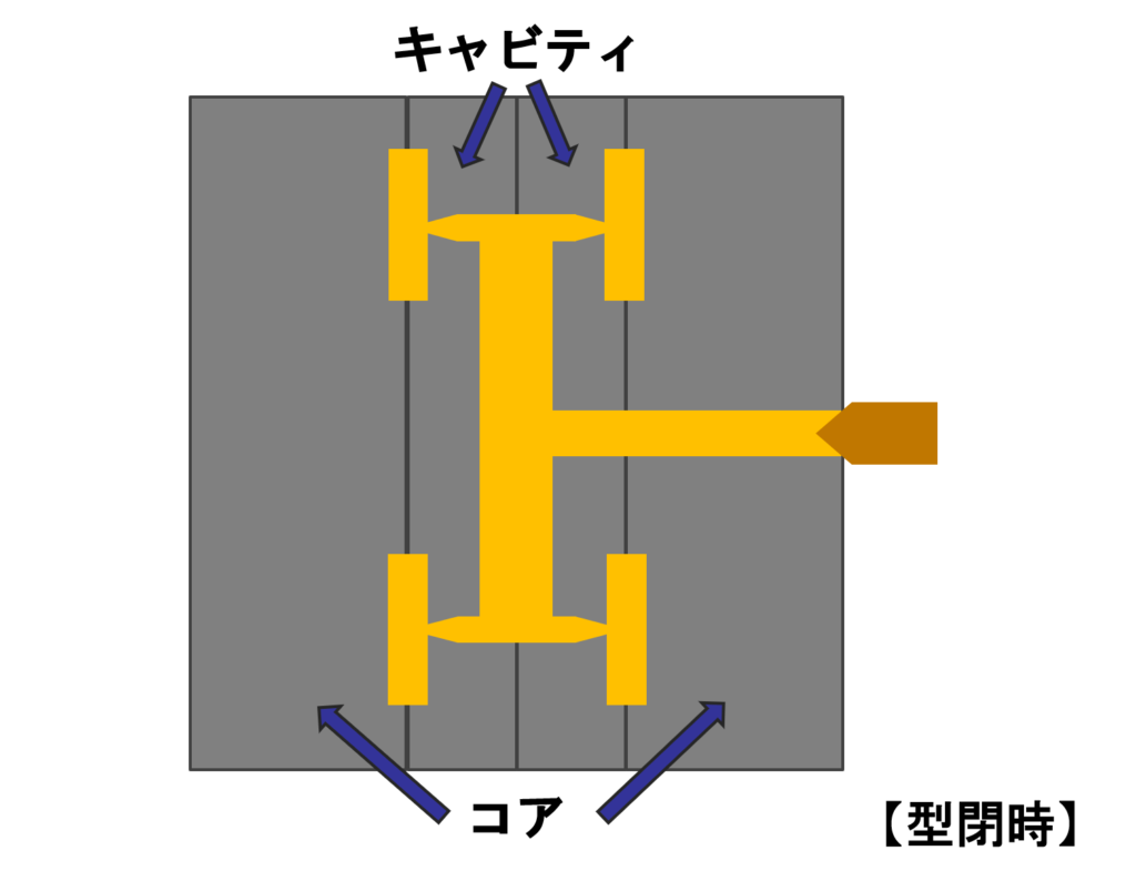 上記の通り、一つの金型内に、キャビティとコアがそれぞれ2つあるため、金型一面で二面分の製品取りができます。